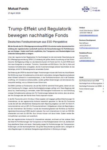 Die zunehmende geopolitische Fragmentierung und regulatorische Dynamik verändern derzeit die Kapitalmärkte und Anlagepräferenzen grundlegend. Insbesondere im Bereich nachhaltiger Investments zeigt sich, dass politische Entwicklungen und regulatorische Eingriffe direkte Auswirkungen auf Kapitalallokationen haben. Vor diesem Hintergrund stellt sich für institutionelle Investoren und Asset Manager die Frage, wie belastbar ESG-Strategien unter veränderten Rahmenbedingungen sind, wie sich regulatorische Anpassungen auswirken und welche Verschiebungen im Fondsuniversum zu beobachten sind. Antworten darauf liefert dieaktuelle Scope Studie „Trump-Effekt und Regulatorik bewegen nachhaltige Fonds". Im Fokus stehen unter anderem die Entwicklung der SFDR-Klassifizierungen, die Rolle von Rüstungsinvestments, regulatorische Anpassungen sowie Veränderungen bei Fondsnamen und -strategien.